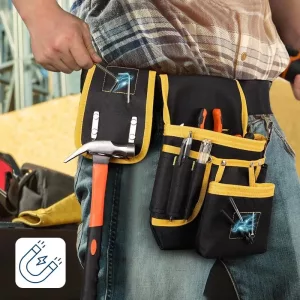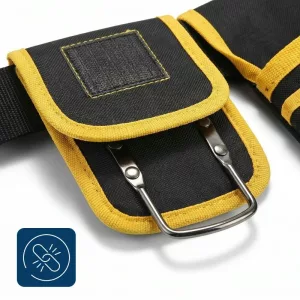 I wear this pouch on long shifts wiring houses. The padded band saves my hips, and I can grab tape, cutters, screws without looking down.