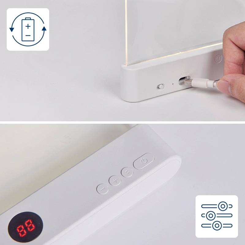 Portable and simple to use. Great for camping trips and cozy nights at home. I can pick how bright I want and my eyes always feel relaxed.
