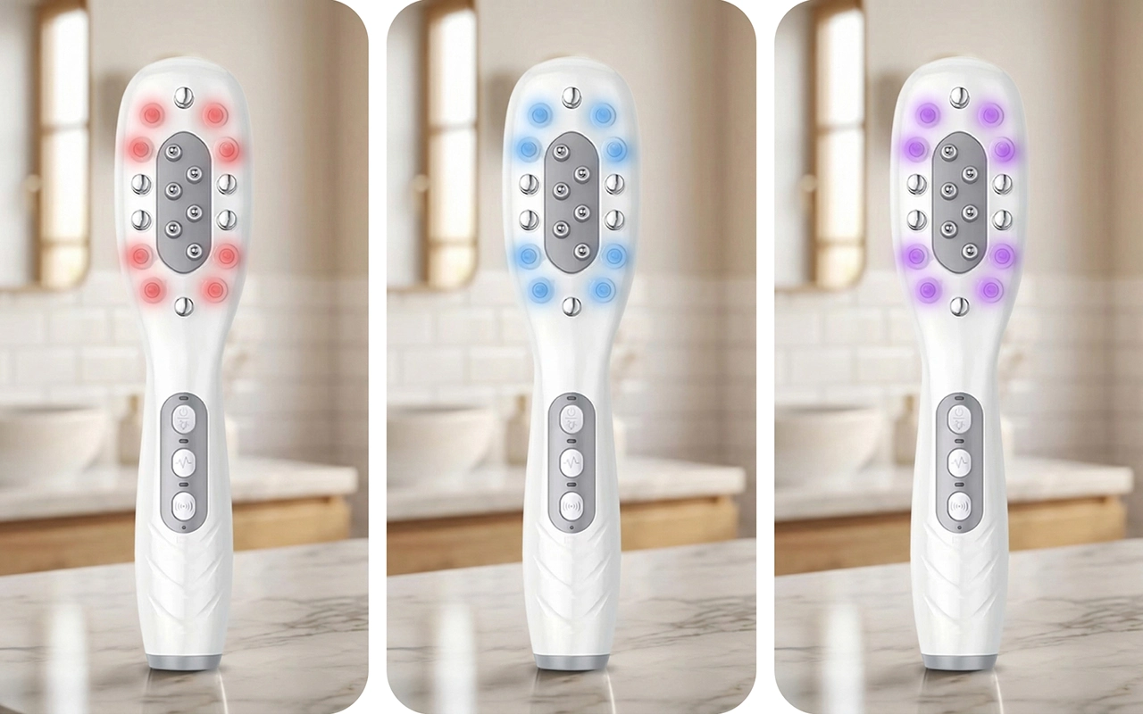 Red, blue, and purple lights target different scalp needs. These modes help strengthen roots, heal follicles, and reduce irritation fast.