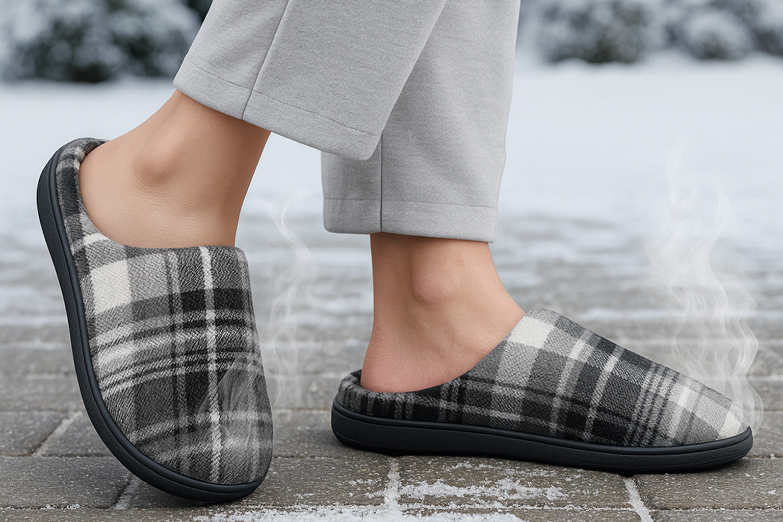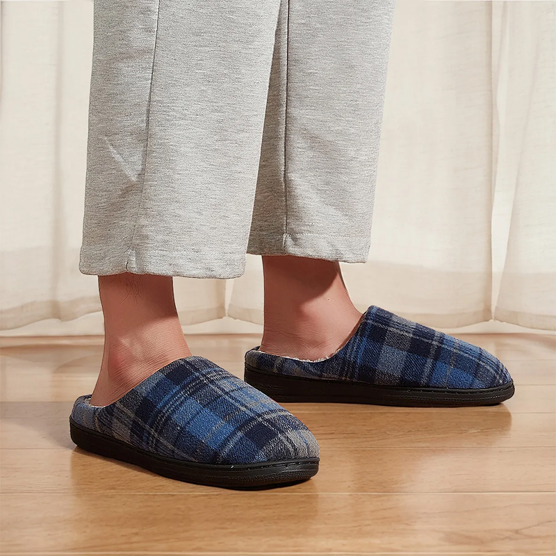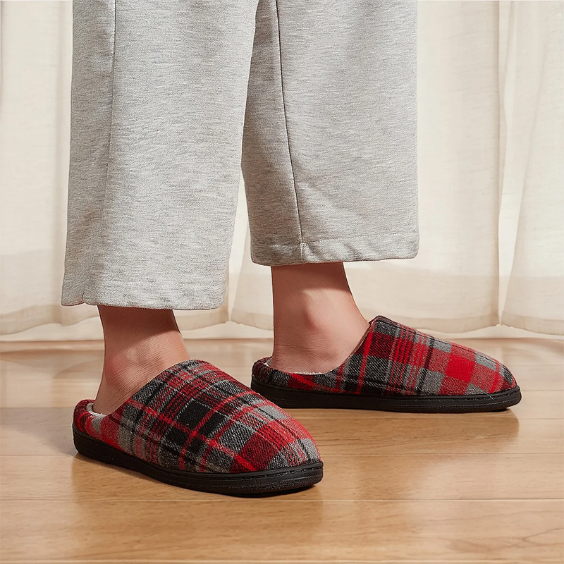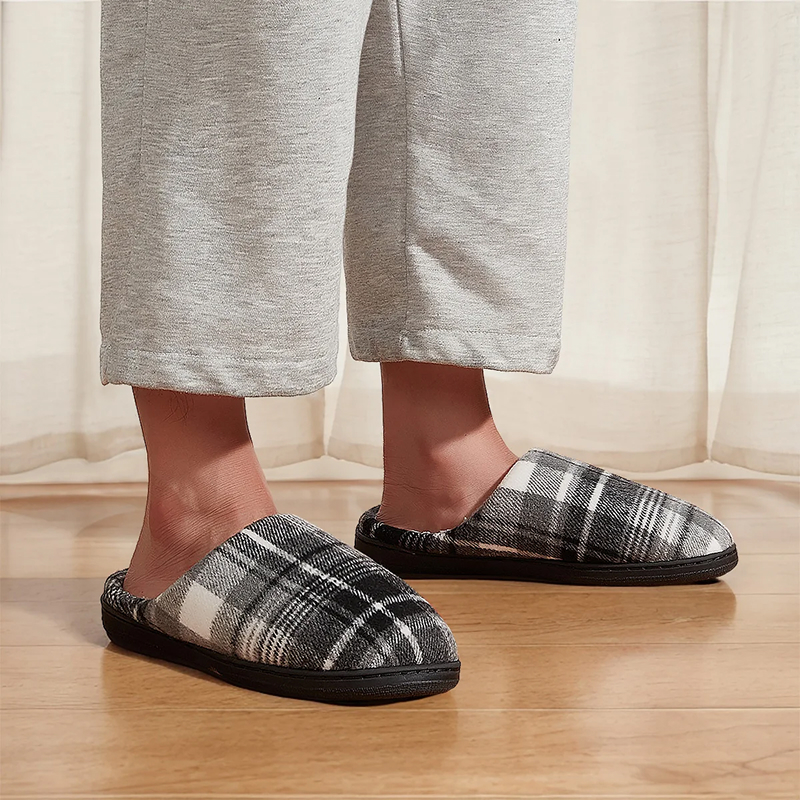 The memory foam molds perfectly around my feet. Love how the cozy plaid looks, and they never fall off while I walk around.